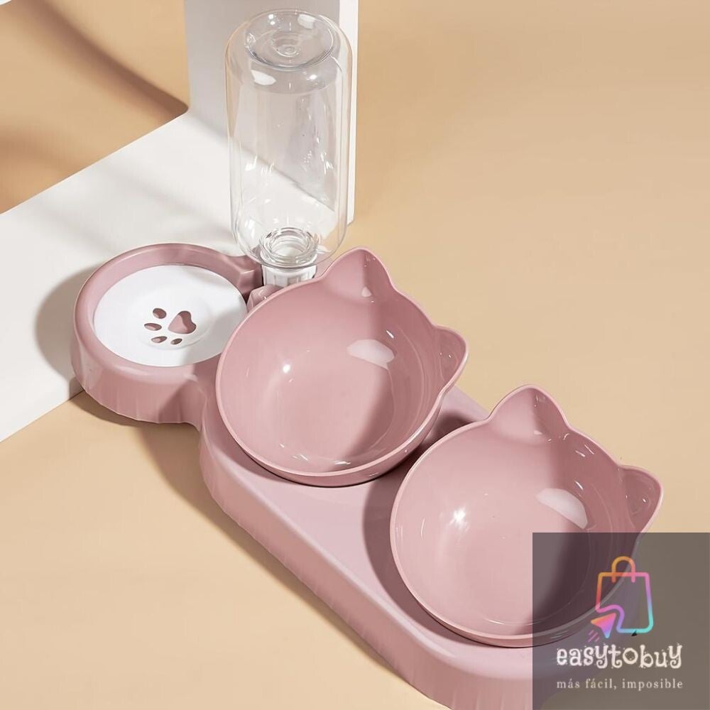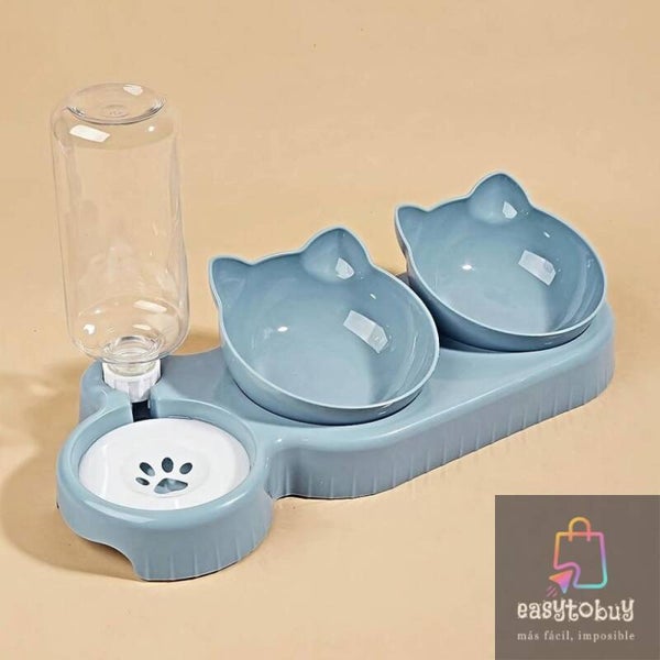 Comedero y bebedero desmontable con diseño animado 3 en 1, con dos cuencos inclinados para la comida y uno para la bebida con botella de funcionalidad automática. Perfecto para la comodidad diaria de tu mascota.